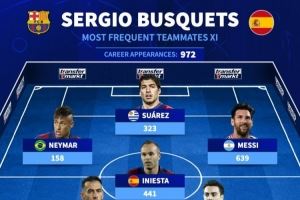 德转评布斯克茨最常搭档11人阵容​:梅西639场第1,皮克605场第2